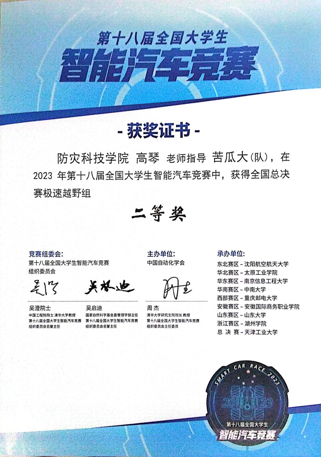 2023年8月17日-8月20日,第18届全国大学生智能汽车竞赛全国总决赛在天津工业大学圆满举办。由威廉希尔官网威廉希尔体育高琴老师指导,刘苑苑、黄庆成、冯伟同学组成的竞速类“极速越野组”,以华北赛区第5名的好成绩进入全国总决赛,历经三天的现场环境适应、预赛和决赛层层挑战,最终进入全国20强,荣获全国二等奖。