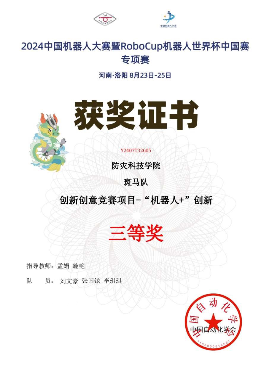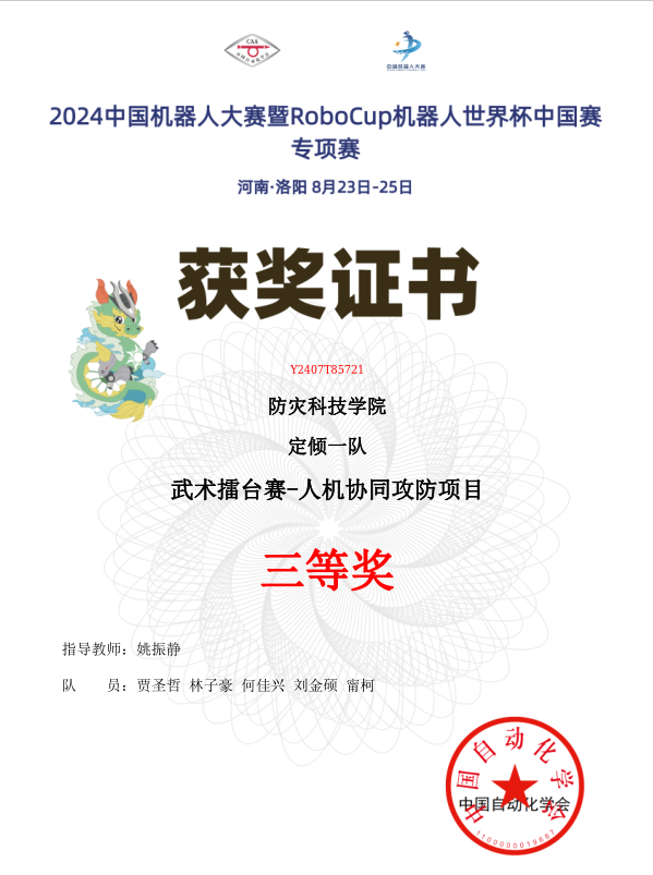 近日,中国机器人大赛暨RoboCup机器人世界杯中国赛在河南洛阳圆满举办。在学院蔡建羡、姚振静、孟娟、施艳四位老师的指导下,由贾圣哲、林子豪等同学组成的定倾队,在人机协同攻防赛中荣获三等奖;由刘文豪、张国铉等同学组成的斑马队,在创新创意赛中荣获三等奖。