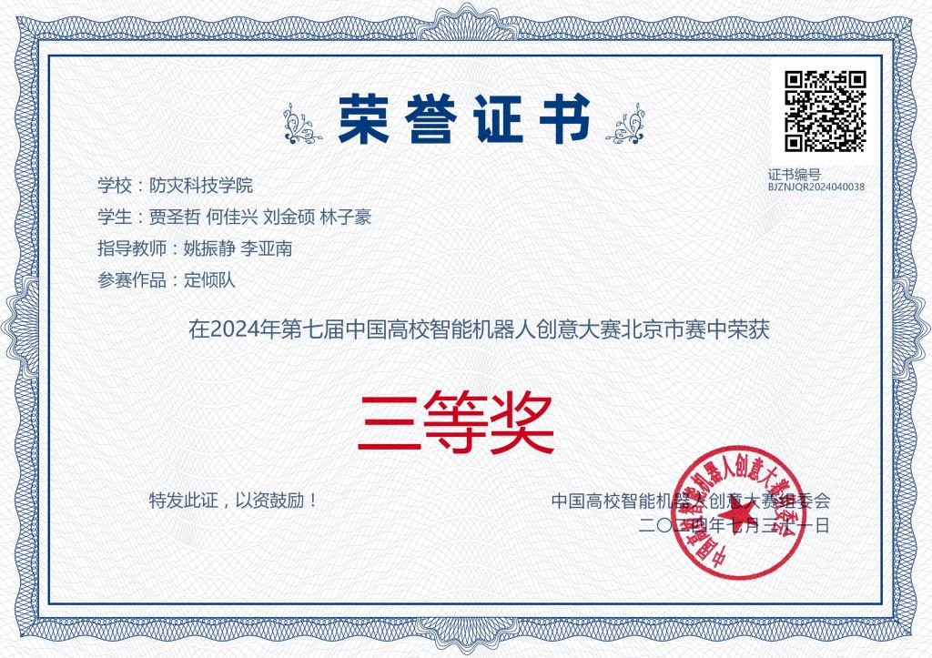 2024年第七届中国高校智能机器人创意大赛北京市赛在北京圆满举办。在威廉希尔体育姚振静、李亚南两位老师的指导下,由贾圣哲、林子豪等同学组成的定倾队荣获三等奖。