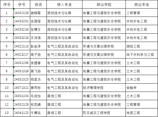 依据《应急管理大学教务处筹备组文件》(教务处筹〔2025〕31号)、《防灾科技学院本科生转专业管理办法》(防科教〔2019〕32号)等相关规定,经学生本人提出申请、转入学院对学生成绩进行审核、面试等环节予以综合评定,结合学院党政联席会讨论决议,拟批准以下学生的转专业申请,现予以公示。