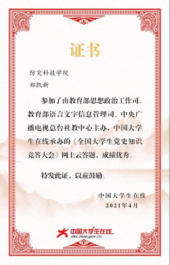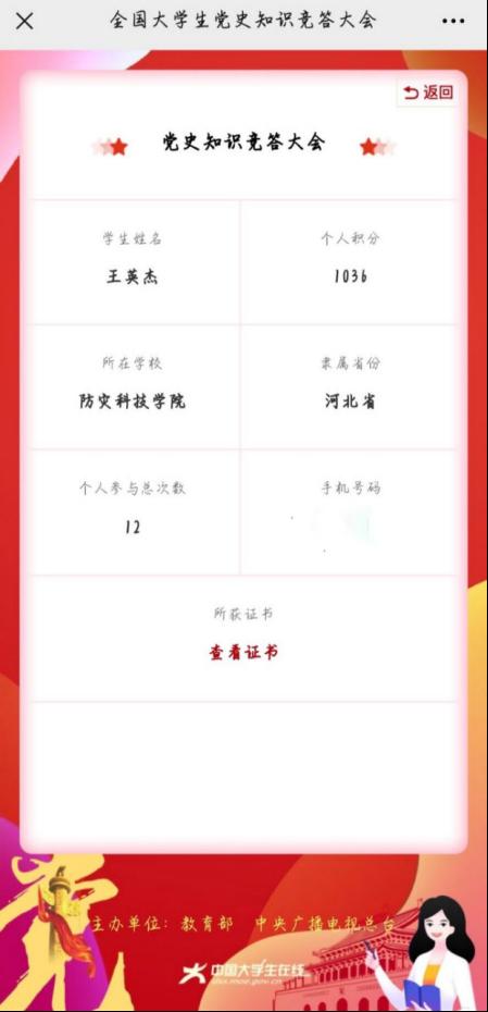 最后,由团总支·组织部对各班答题数据与名单进行汇总评比,评选出参与度最高的五个团支部。在本次党史知识竞答大会过程中,各年级同学均踊跃参加,参与班级包含来自三个年级的24个班,共418位学生。其中296人获得电子学习证书(图二,图三),4个团支部参与度达到100%。通过本次活动,促进了学生们对中国共产党建党以及发展历程的了解,深入领悟党团理论知识,同时重温了党的光辉历程,收获良多。