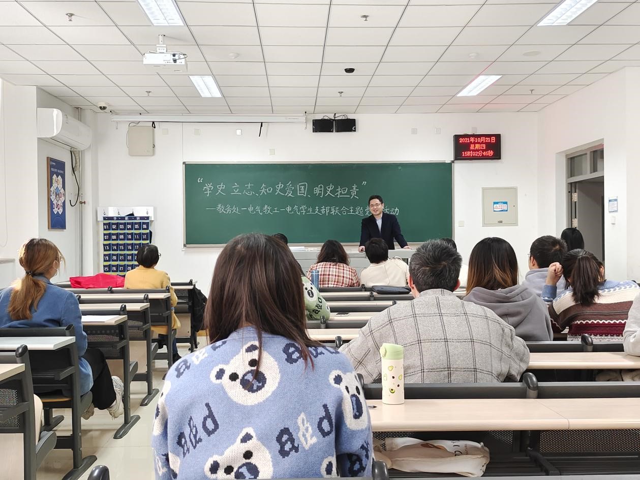 10月21日,威廉希尔体育电气师生党支部联合教务处党支部共同举办“学史立志、知史爱国、明史担责”主题党日活动。教务处党支部代表吴鹏老师、电气师生党支部全体党员参加本次活动,活动由电气教工党支部书记李立新主持。