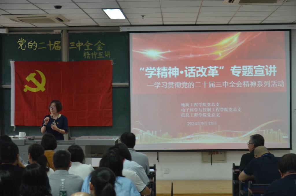 为更好地学习和贯彻党的二十届三中全会精神,9月13日上午威廉希尔体育党总支、地质工程学院党总支和信息工程学院党总支联合开展党的二十届三中全会精神宣讲活动。本次活动由马克思主义学院副院长黄萍教授进行宣讲,三个学院的全体教师和在校生党员代表参加学习。