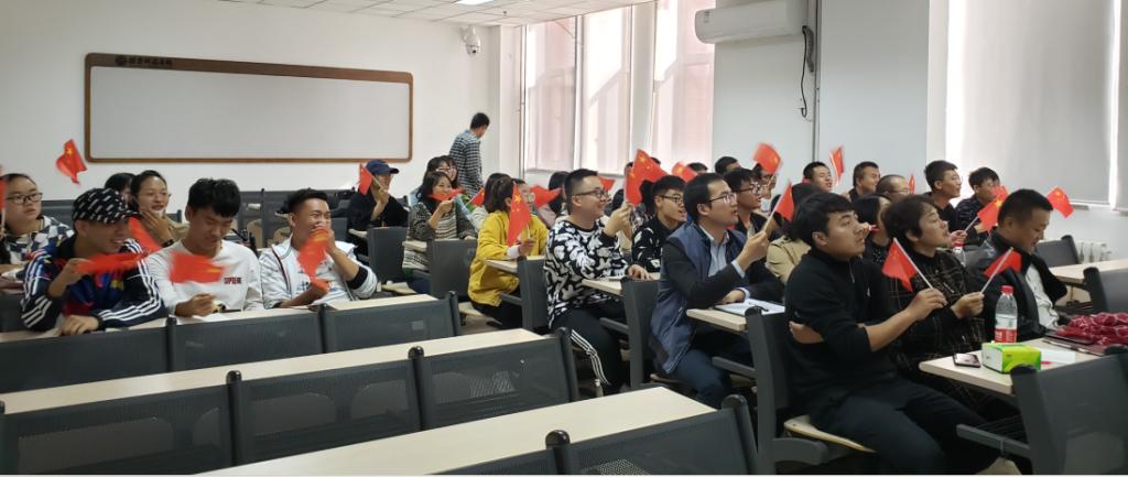 活动由团支书和副班长主持开场,首先为在座老师和同学分发小红旗,以增加在座老师和同学的参与感。第一项日程,团支书引导同学们回顾历史,同学们观看关于中国发展历史的视频,观看完视频后,同学们积极讨论,并发表自己的感想。第二项日程,由副班长为同学们讲述新中国成立后所取得的巨大成就,增加同学们心中的荣誉感与自豪感。第三项日程,由文艺委员带领同学们朗诵《给祖国的情书》,团支书组织同学们提起笔来直抒胸臆,抒发自己对祖国的赞美,并起立朗诵。第四项日程,由文艺委员带领同学们合唱《我和我的祖国》,用歌声表白祖国。最后由李亚南老师点评并抒发感想。