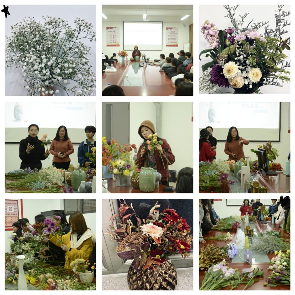 课堂上,雷老师用通俗易懂的语言为大家详细的讲解了插花花材花器的识别、东西方插花的区别、色彩的搭配、位置角度摆放技巧等花艺知识,现场老师边示范边讲解插花步骤。现场的同学们仔细聆听,细致观摩,深入体验,现场气氛轻松活跃。花艺课的开展增加了同学们对各种花的了解,也让大家知道了如何购花以及如何护理花,更是收获一份美丽的心情。