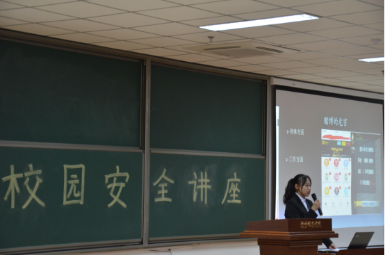 讲座中,林婧怡同学根据当前未成年人法制和安全意识薄弱的现象,从防诈骗,防赌博,校园贷等各方面阐述了法制与安全的要点和重要性。