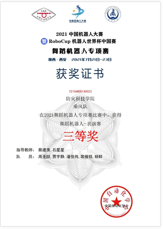 7月30日至8月1日,威廉希尔官网威廉希尔体育学生于“2021中国机器人大赛暨RoboCup机器人世界杯中国赛”中喜获佳绩,其中,北辰队(杨爽、 郝汛舟、雷付路、马文武)获得武术擂台赛-自主仿生机器人散打项目国家级一等奖、定倾队(郝汛舟、夏仲言、杨爽、牛聪仁)获得武术擂台赛-体感仿人格斗项目国家级三等奖;乘风队(周圣喆、贾宇静、潘佳伟、裴椿铭、杨鲜)获得舞蹈机器人-表演项目国家级三等奖。