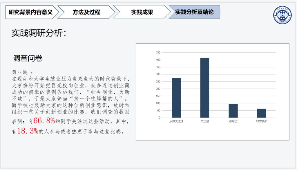 答辩过程中,各团队的答辩主讲人将团队介绍、项目背景、选题来源、实践过程、最终成果、社会评价等进行讲解介绍,分享实践经历,勾勒出完整的实践流程。各项目将专业特色、技术优势与社会实际相结合,聚焦乡村振兴,发掘乡村振兴战略,宣传防震减灾,助力冬奥盛会,专注创新创业,主题多彩,成果丰富,从社会实践的不同角度,探索大学生实践的意义,接受社会的锻炼。每个答辩人员完成展示之后,评委对其团队的实践方案和细节做出点评,指出部分问题,提出相关建议,最后进行评分。
