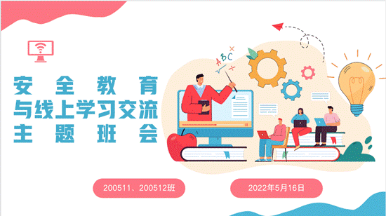 为提升同学们的安全防范意识,确保居家学习效率,树立良好学风, 200511、200512班于2022年5月16日以钉钉线上会议形式召开安全教育和线上学习交流主题班会,200511班班主任杨敬松老师和辅导员郭越老师参加了本次班会。