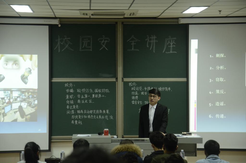 本次讲座主要分为校内和校外两部分宣传内容,首先,由主讲人崔喜伟讲述校内所存在的安全隐患,从防赌、防盗、防校园贷、宿舍安全四个方面进行了详细阐述,其宣传内容提醒同学们要保护好个人财产、遵守宿舍文明准则、正确使用互联网、不沾染赌博恶习、控制自己的消费欲望、不得存在侥幸心理使用贷款等。其次,崔喜伟同学就校内问题引申到校外层次,以一种幽默而不失严谨的方式讲述了有关于诈骗、传销、非法集资等方面的危害性,联系了自己和身边人的事例,告诉同学们该怎样远离、杜绝该方面的危险,如遇到应该怎样脱险,如何最大程度保护好自己的人身、财产安全;接着,主讲人着重告知同学们兼职方面的要点:1、明确兼职的目的;2、识别兼职的真假;3、保护好自身生命财产安全。最后,崔喜伟同学分析了当代大学生中普遍存在的问题,并为同学们介绍了正确的价值观的意义和如何培养正确的价值观。