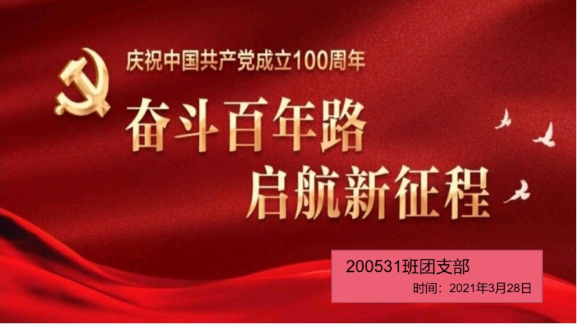 为深入学习贯彻党的十九大、十九届历次全会精神,学习中国共产党的光荣历史,鼓舞人心、凝聚力量。200531班团支部于3月28日晚上七点,在天仪楼506开展“奋斗百年路 ·启航新征程”主题团日活动。由于目前学校疫情防控工作,本次团日活动以线下观看视频的形式开展。参与人员为200531班全体同学。
