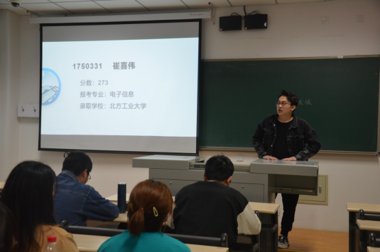 晚上19:00,崔喜伟学长主持了通信考研经验分享会,胡佳佳学姐将自己的考研经验制作成视频播放。她为我们讲解了自己在政治,英语,数学以及专业课上自己的复习对策,用自己的经历告诉我们要时刻相信自己,不要随意否定自己。接着耿艺凯学长,罗灿学长,陈明池学长从复习书籍的选择方面向同学们介绍,比如数学方面的李林老师880题,汤家凤1800题接力;政治方面的肖四和肖八,徐涛老师的考研视频等等。崔喜伟学长告诉各位同学有时选择比努力更重要,同时努力也是必不可少的。最后,在各位优秀学长分享完经验后,有许多同学开始询问相关大学的信息,学长也提出了许多宝贵的意见。至此通信专业考研经验分享会圆满结束。